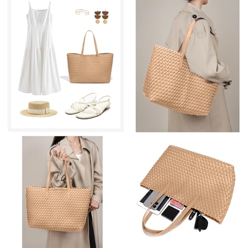 Large Capacity Shoulder Handbag Woven Leather Tote Bag with Matching Pouch Travel Lightweight 5