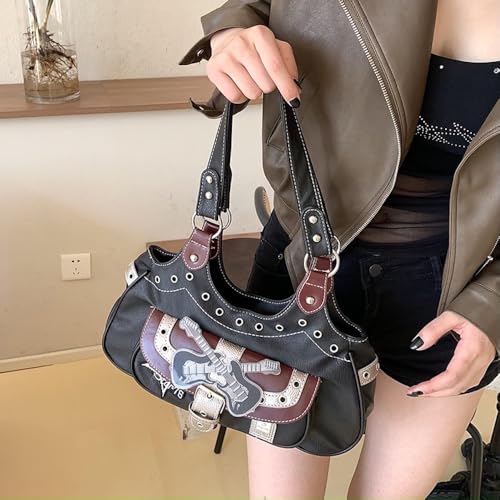 JHTPSLR Rivet Belt Punk Y2k Leather Shoulder Purse for Women Guitar Star Dark Grunge Goth Bag 2000s Streetwear 2