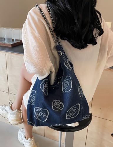 Denim Hobo Tote Bag for Women,Jean Casual Shoulder Purse with Floral Pattern、Chain Strap 5
