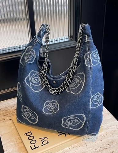 HOT ! Denim Hobo Tote Bag for Women,Jean Casual Shoulder Purse with Floral Pattern、Chain Strap