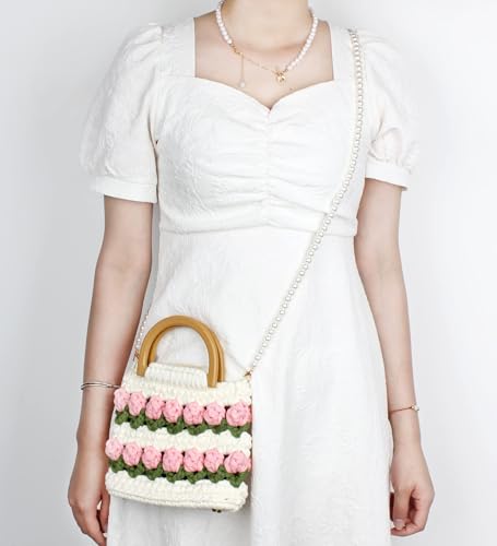 Women's Handbag Yarn Crochet Top Handle Purse Cute Tulip Handmade Beaded Crossbody Shoulder 5