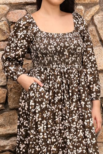 RITERA Plus Size Dresses for Curvy Women Square Neck Fall Long Sleeve Floral Smocked Maxi Dress with Pocket XL-5XL 6