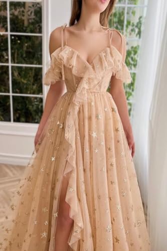 • Features:Cold-Shoulder tulle sparkly long prom dress,ruffles hem with high slit,v neck,a line,lace up back straps,spaghetti straps,fully lined,starry stars formal party dress for women.