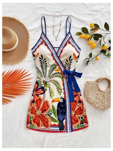 Women's Tropical Print Wrap V Neck Mini Dress Tie Waist Sleeveless Summer Vacation Boho Dresses 1