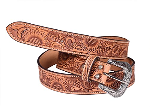 Tooled Genuine Leather Sunflower Design Western Belt With Removeable Buckle 30WE001 1
