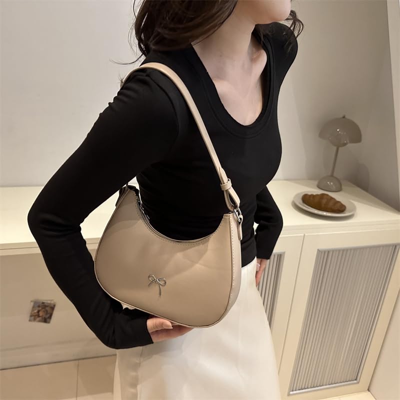 HOT ! Women PU Armpit Bag with Zipper Bowknot Trendy Handbag Solid Color Leather Shoulder Bag Half Moon Bag for Vacation Travel Commuting