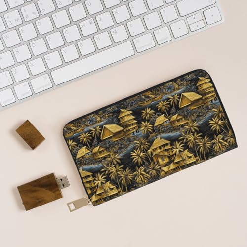 HOT ! Hawaiian Retro Golden Scenery Print Wallet Women, Leather Bifold Multi Card Wallet, Long Purse Women's Wallets