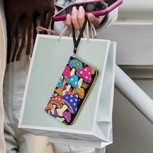 HOT ! Travel Slim Wallet for Women, Large Capacity Credit Card Holder Neon Mushrooms Pattern Colorful Purse Pu Leather Waterproof Long Wallet