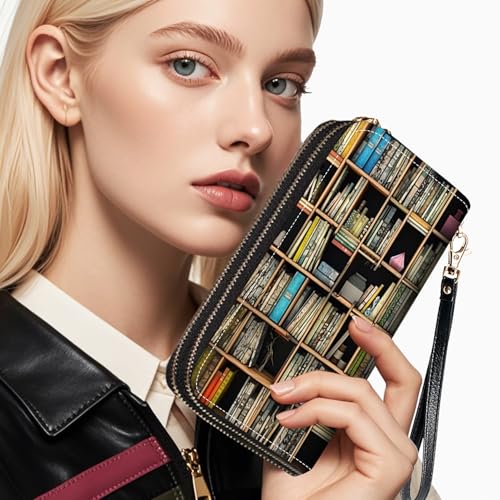 More information about Bookshelf Print Women Large Capacity Wallet PU Leather Double Zipper Clutch Purse for Smart Phone/Card/Coin/Cash