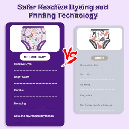 • Absorbent and Breathable: MOEMOE BABY absorbent training underwear help toddlers learn physical signs that it's time to independent toilet usage. Our breathable potty training pants are made with a TPU layer in crotch to contain accidents. Additionally, these training underwear can boost baby’s self-esteem and decrease their feelings of embarrassment, encouraging baby to actively participate in learning and playing
