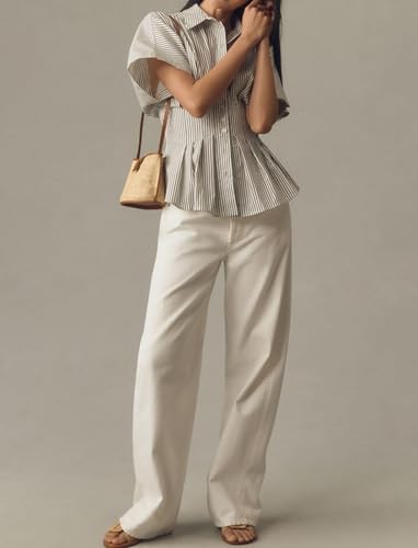 • Fur description: Womens Striped Peplum Button Down Shirts Short Sleeve Pleated Tops Summer Business Casual Blouses