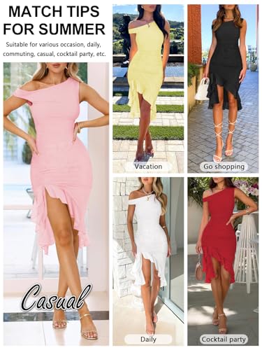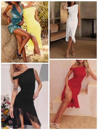 • 【Features】This elegant cocktail party dress features a sexy off the shoulder look that showcases your collarbone. The irregular mesh ruffled hem with a slit design keeps you cool and comfortable. This fashionable and tight fitting one shoulder women's dress better interprets your perfect figure, providing a comfortable wearing experience and making your figure slimmer.