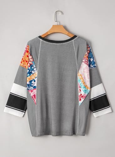 EVALESS 3/4 Length Sleeve Womens Tops Dressy Casual 2025 Fall Crew Neck Oversized Striped Patchwork Shirts Blouse 3
