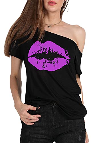 MAGICMK Women’s Short Lips Print Causal Off The Shoulder Plus Size T-Shirt Tops 7