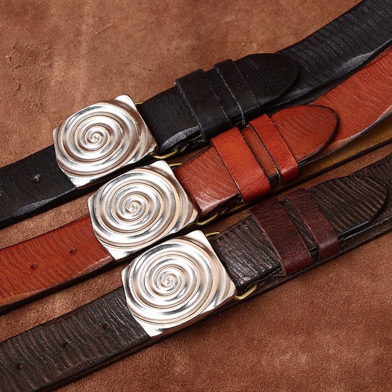 HOT ! Retro Snap Belts with Engraved Unique Spiral Shapes Silver Buckle - Washed Top Grain Leather Strap for Every Occasion(130cm/51, Black)