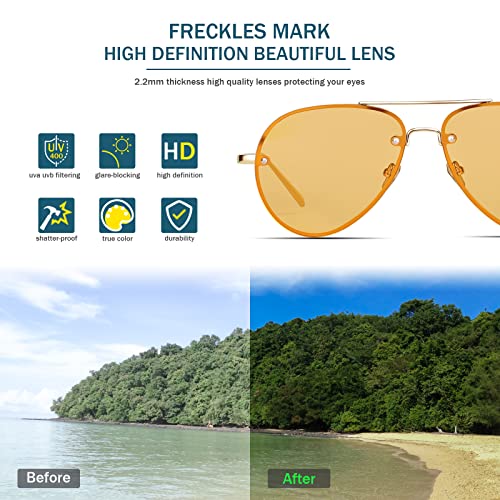 • Classic Pilot Aviator Design: Freckles Mark aviator sunglasses for women men are designed with double metal bridge; large flat tinted lenses; rimless design. They are classic and classy. Please kindly note, the lenses are straight across but frame is adjustable. If you prefer a curve for the shades, gently bend the frame with your hands. Don't worry about breaking the glasses, they are much more resilient than we think :). If you run into any issue, please contact us on amazon