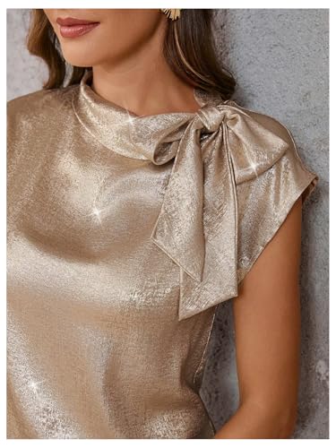 SOLY HUX Women's Metallic Tops Bow Tie Mock Neck Cap Sleeve Elegant Blouse 4