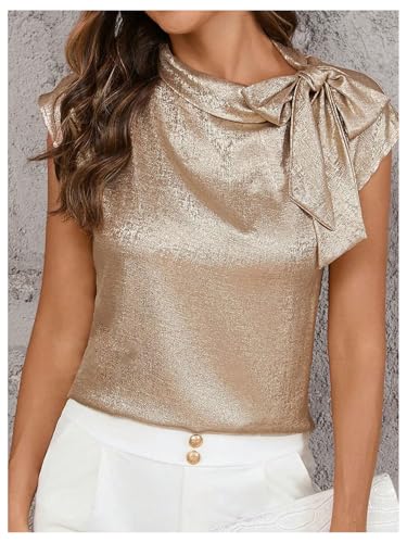 SOLY HUX Women's Metallic Tops Bow Tie Mock Neck Cap Sleeve Elegant Blouse 1