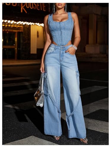 WDIRARA Women's Sequin Square Neck Hook Eye Denim Tank Top Sleeveless Asymmetrical Jean Crop Top 3