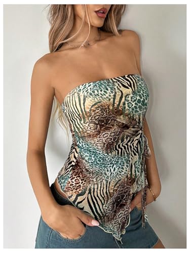 • Feature: Cheetah Print, Ruched, Strapless, Drawstring, Asymmetrical Hem, Sleeveless, Slim Fit, Bandeau Tube Tops
