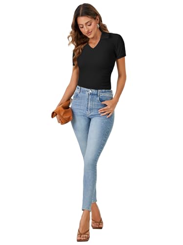 More information about LYANER Women's Short Sleeve V Neck T Shirts Ribbed Knit Slim Fit Tee Top Stripes Collar Polo Shirt