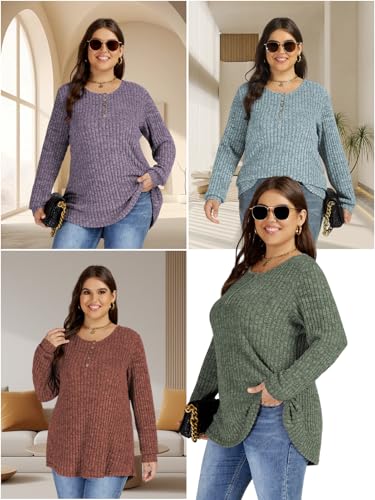 ROSRISS Womens-Plus-Size-Tops Trendy Long Sleeve Henley Shirts Casual Ribbed Knit Tunics Dressy Crewneck Pullover Sweaters 3