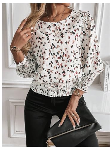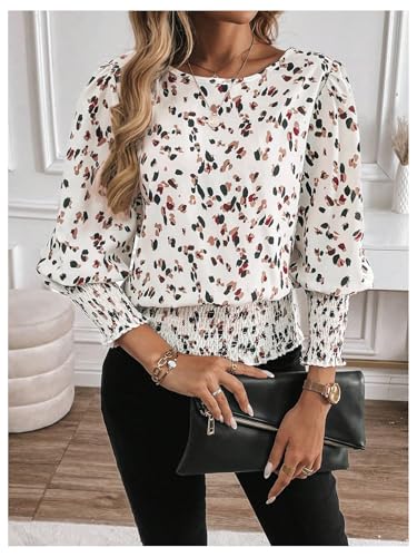 HOT ! SweatyRocks Women's Lantern Long Sleeve Shirred Trim Round Neck Smocked Blouse Crop Tops