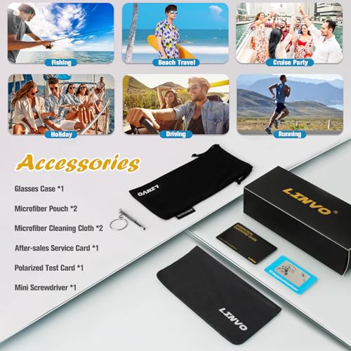 • 【UV400 Protection & HD Polarized Lens】LINVO sunglasses are coated with UV400 protection, which can block 100% harmful UVA & UVB rays. Polarized lenses effectively reduce glare, eliminate reflected and scattered light, restore true color, and protect your eyes perfectly.