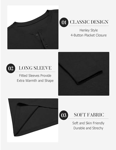 • 【STYLISH DESIGN】:The henley long sleeve shirts feature a henley style with a long sleeves, round neck and a 4-button detail. These Tee shirts, available in solid colors, offer a simple yet classic look. The henley neckline and button-down details create timeless, stylish, and functional apparel.