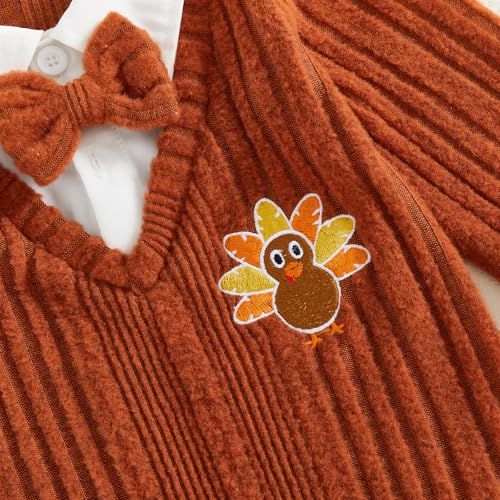 • designs: The thanksgiving toddler boy’s jumpsuit has long sleeve, turn-down collar with a bow tie; Embroidery turkey pattern; Crotch button for easy diaper change, fashionable and lovely, thanksgiving bubble outfits for baby boys, newborn boy clothes thanksgiving, baby girl turkey outfit, toddler baby turkry knit jumpsuit