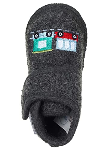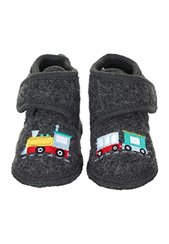 • Felt slippers with train embroidery and appliqué, with Velcro closure and non-slip sole made of natural rubber