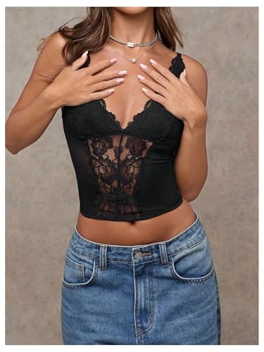 • Features: Lace bustier corset top for women, spaghetti straps, cut out back, cropped, sexy, slim fit, sheer mesh camisole tops