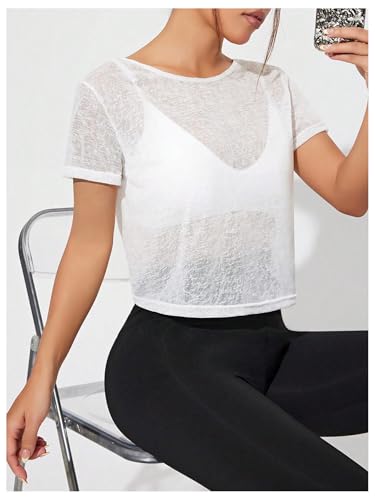 HOT ! SweatyRocks Women's Twist Cutout Open Back Short Sleeve Sheer Mesh Workout T Shirts Smocked Crop Top