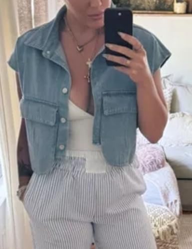 More information about Womens Denim Cropped Button Down Shirt Collared Sleeveless Summer Loose Jean Crop Top with Pockets