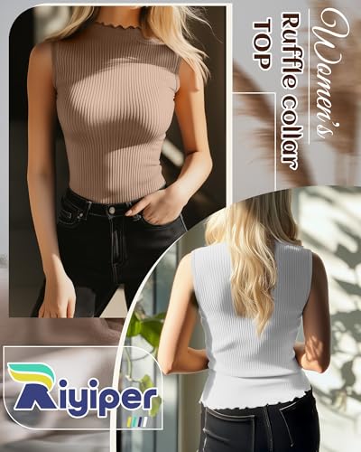 Riyiper 3 Pack Women's Sleeveless Mock Turtlenecks Shirts Lettuce Trim Ribbed Knit Slim Summer Casual Tank Tops Basic Tees 6
