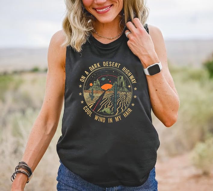 • DESIGN: Trendy sleeveless tank top featuring a unique desert highway graphic with cactus and sunset design in vintage style