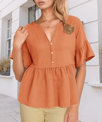 Jenbou V Neck T Shirts for Women Button Down Short Sleeve Tops Ruffle Tiered Loose Fit Peplum Tops 5