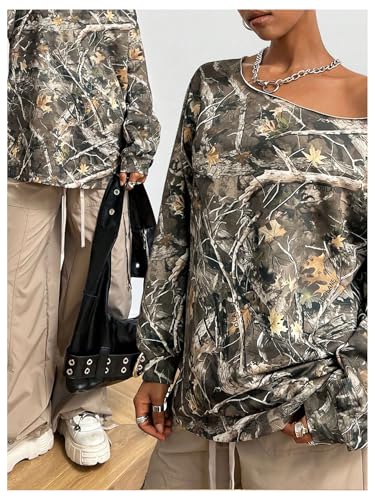 HOT ! Women's Y2k Camo Shirt Tropical Graphic Off The Shoulder Sweatshirt Oversized T Shirts Long Sleeve Camouflage Tee Top