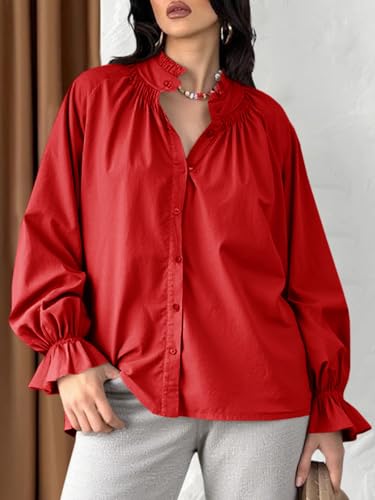 Tankaneo Womens Puff Long Sleeve Button Down Shirts Pleated V Neck Cotton Blouses Loose Fit Casual Ruffle Tops 5