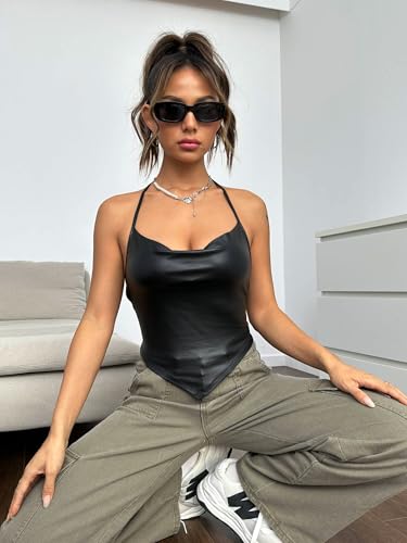 More information about OYOANGLE Women's PU Leather Going Out Top Summer Sleeveless Draped Halter Crop Tank Cami Top