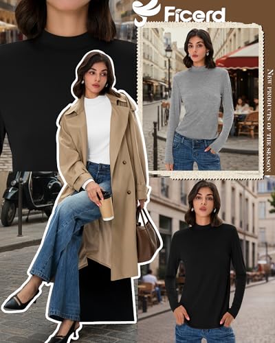 Ficerd 3 Pack Women's Mock Turtleneck Shirts, Long Sleeve Mock Neck Pullover Tops Slim Fitted Stretch Undershirt Tee Blouse 1