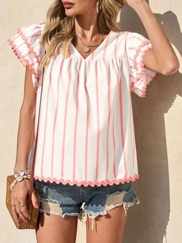 Tankaneo Womens Ruffle Short Sleeve Blouse V Neck Striped Pleated Trim Shirts Summer Casual Loose Fit Tops 1