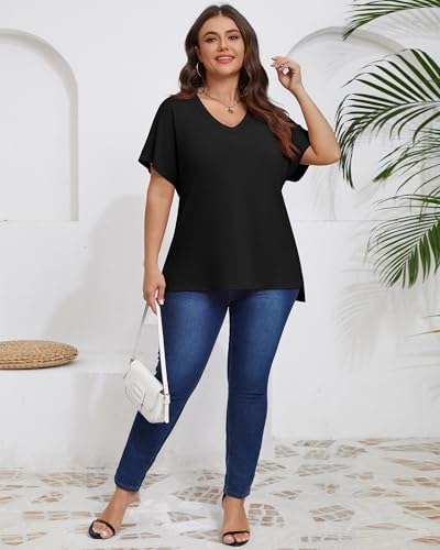 Ficerd 3 Pack Plus Size V Neck T-Shirts for Women, Short Sleeve Split Side High Low Hem Tunics Tops Basic Summer Tee Blouses 3