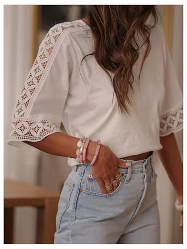 GORGLITTER Women's Embroidered Lace Boho Tops Half Sleeve Crop Crewneck Hollow Out Tee Shirts 5