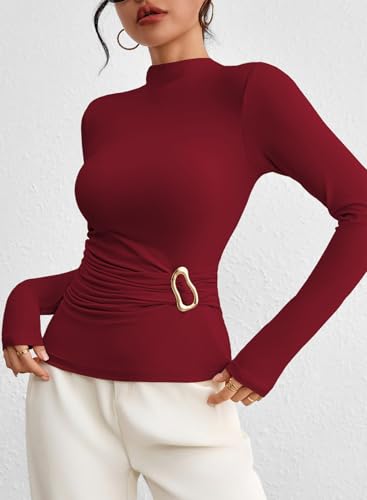 More information about Pink Queen Women's 2025 Fall Long Sleeve Shirts Mock Neck Buttons Decor Ruched Slim Fit Going Out Tops