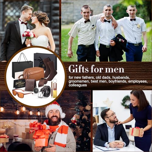 • Broad Variety in One Package: the men's gift set provides a wide range of items specifically designed for men including 1 PU leather wallet, 1 leather toiletry bag, 1 tie, 1 pair of socks, 1 belt, 1 keychain, 1 sunglasses, 1 pen, 1 compass, 1 greeting card, 1 gift box, 1 gift bag; With our gift set, you will enjoy the ease of gifting
