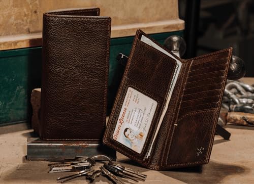 • KEEPS ON KEEPIN': For work, weekends and wherever, Jack's Long Bifold Wallet keeps on keepin' until the day is done. Constructed from masculine full grain cowhide, our Rodeo Wallet delivers function and versatility with generous slots and pockets to protect your investments. This handcrafted men's tall wallet will develop a rich patina with time and use. Quality leather - quality stitching - quality all the way around!