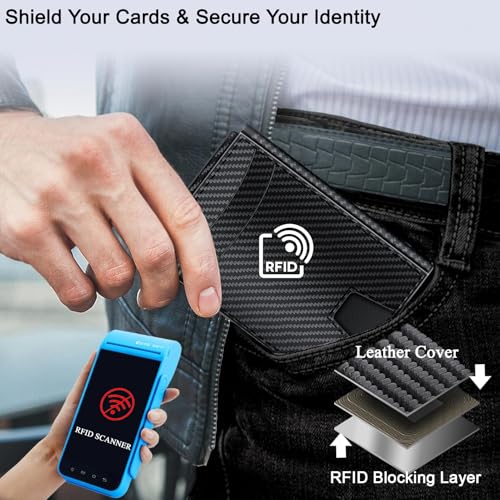• RFID Wallet for Men: Minimalist wallet holds up to 12+ cards. Features an card chamber (6-8 cards), 4 credit card slots, 2 ID windows and a money clip. Easy to open and close, credit card wallet, money clip for men, mens wallets leather