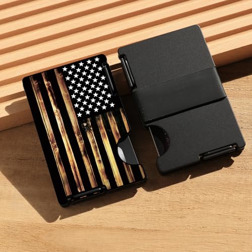 HOT ! Wallet for Men, Minimalist Card Holder with Cash Strap, Slim Metal Front Pocket Wallet, RFID Blocking, Personalized Wood American Flag