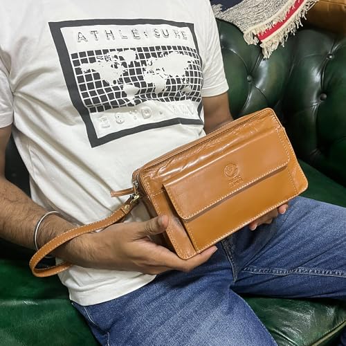 • ✅ SMARTLY DESIGNED: Delve into the clever layout of our Leather Hand Bag, featuring a large main compartment complemented by an interior zipper pocket, key holder, and dedicated slots for cards and pens. The exterior combines style and practicality with a flap pocket and a hidden zippered section at the back. The detachable leather wristband enhances functionality, ensuring your essentials are always within reach.